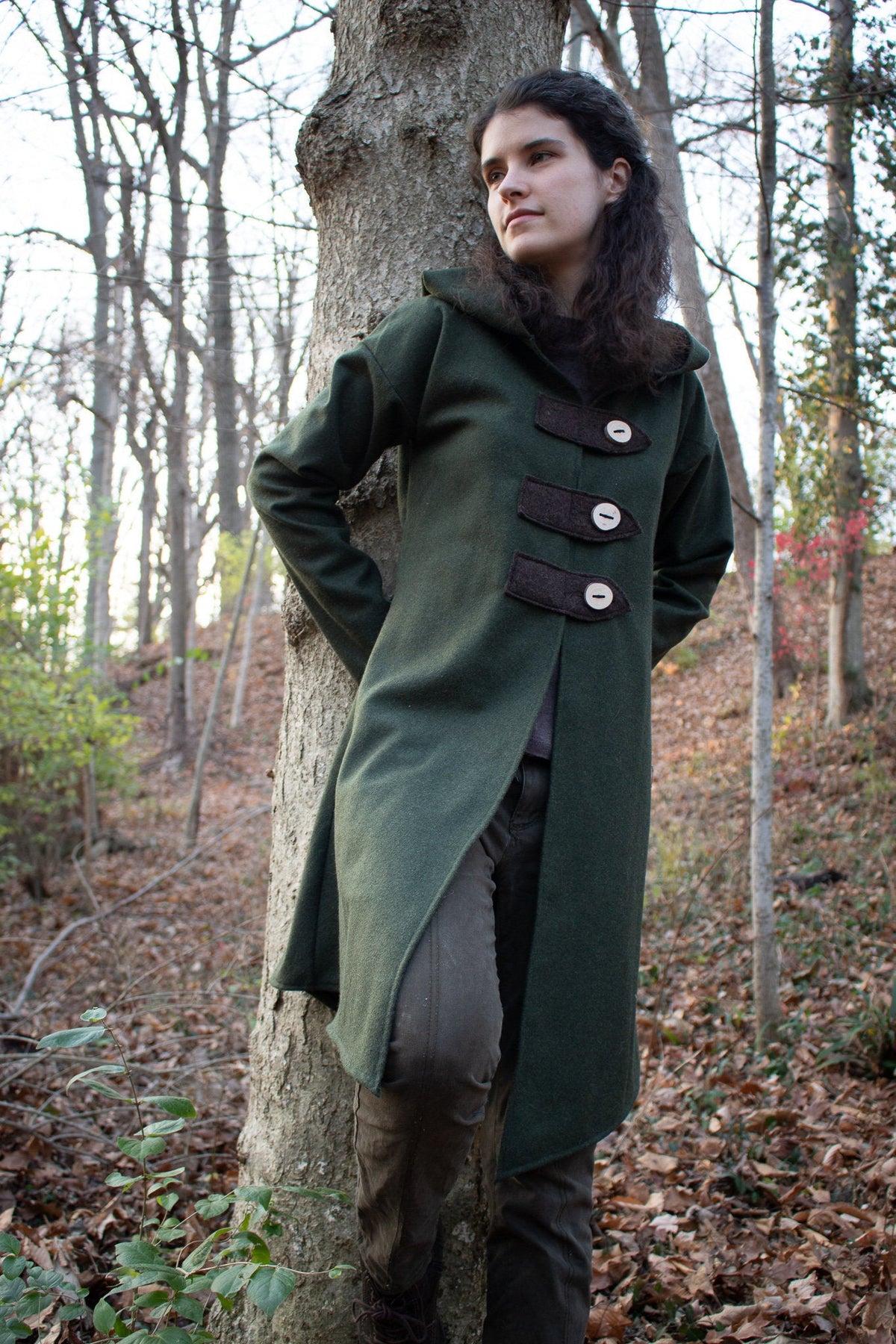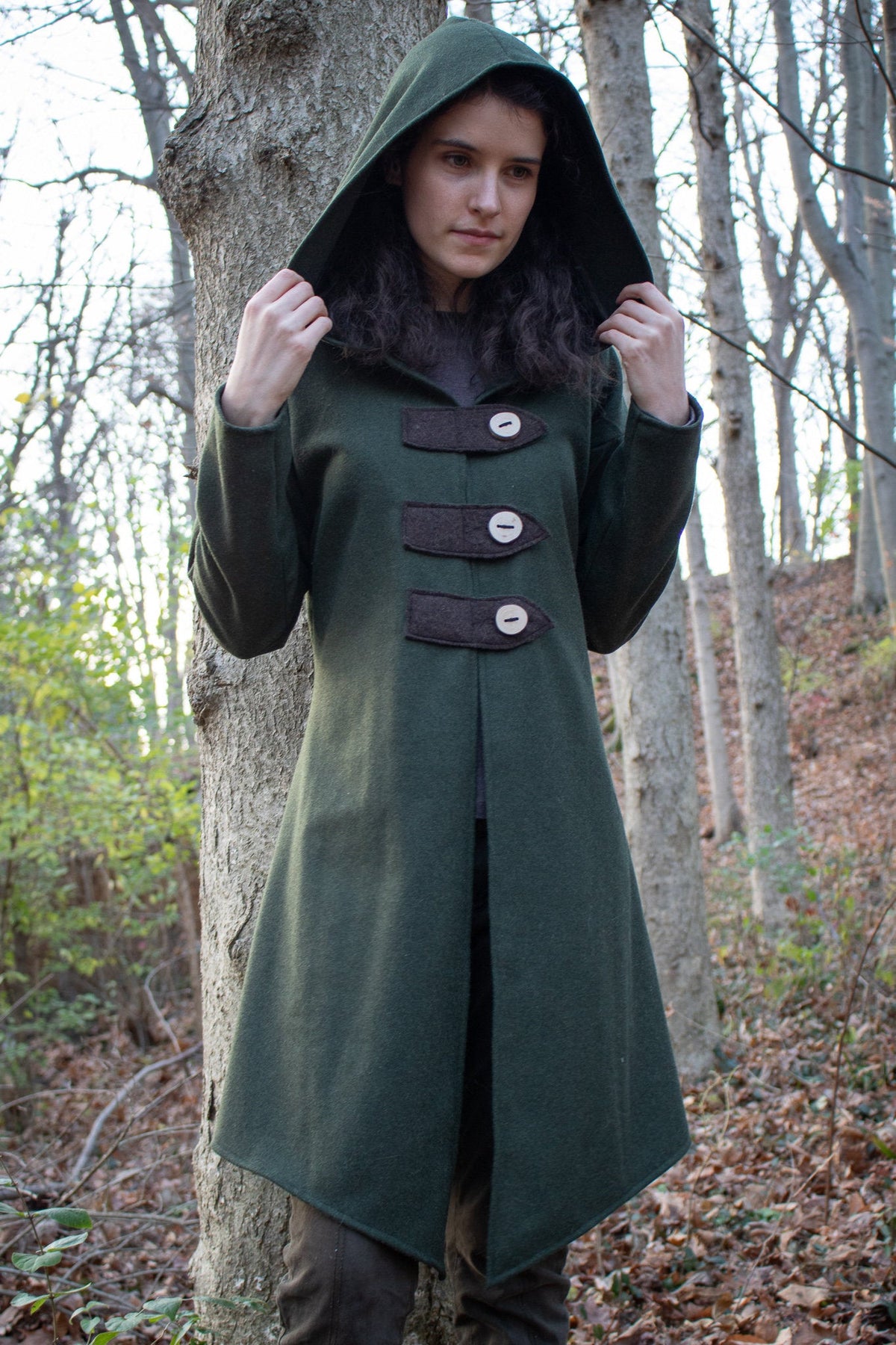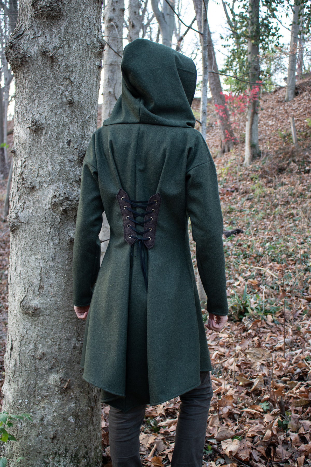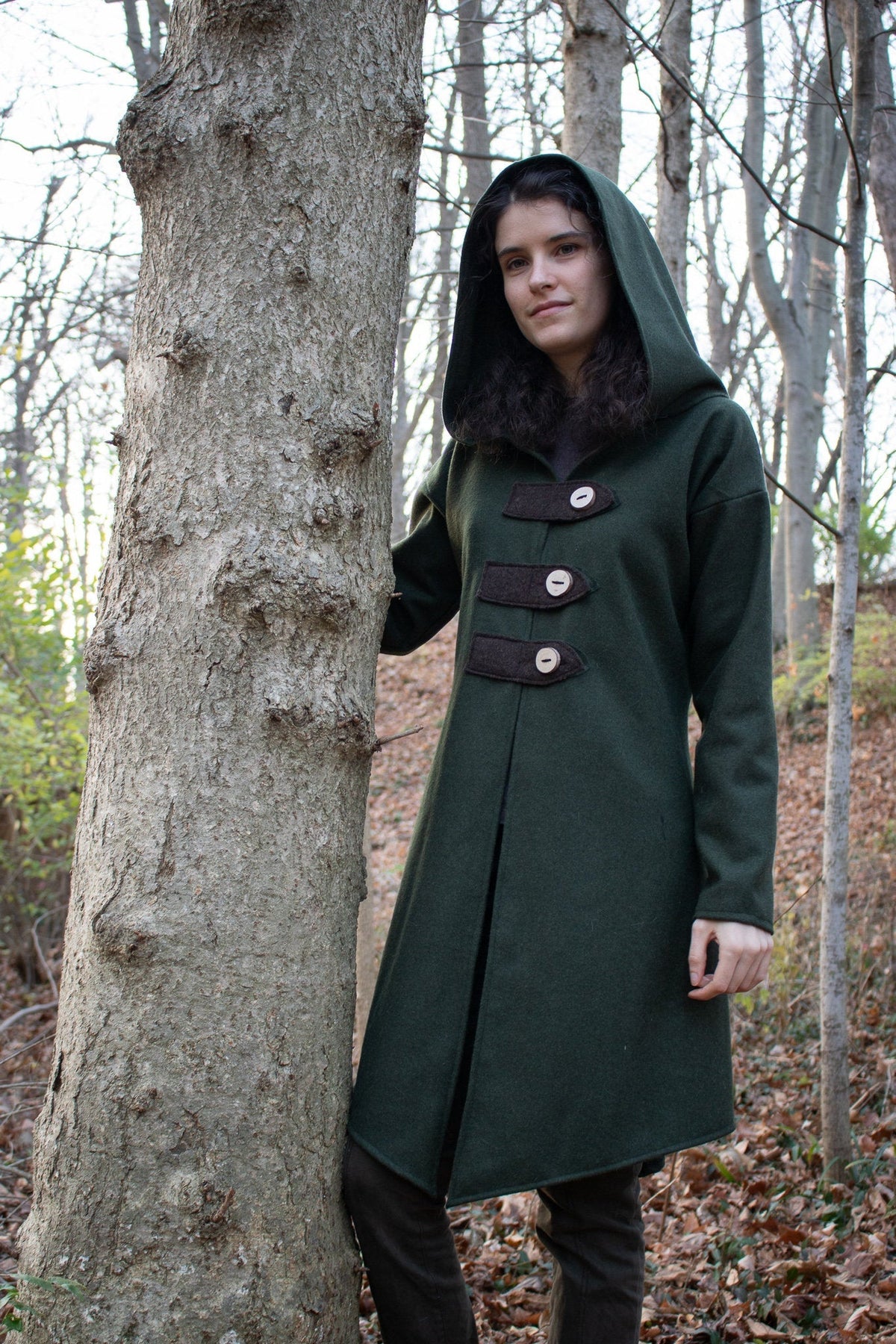 Bring some magic into your everyday life with this deep green hooded wool jacket! This coat features 3 wooden buttons, adjustable back and tapered bottom,