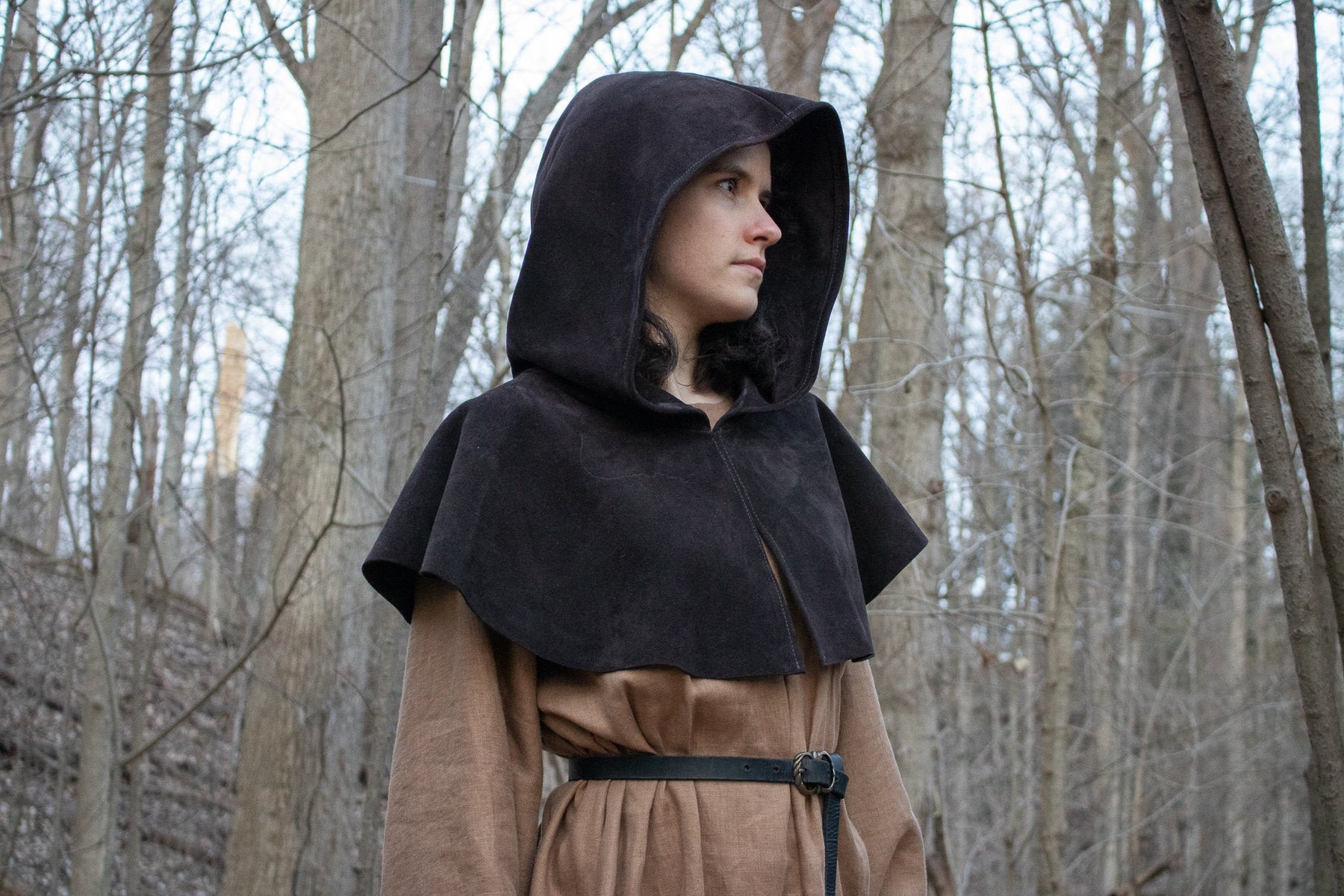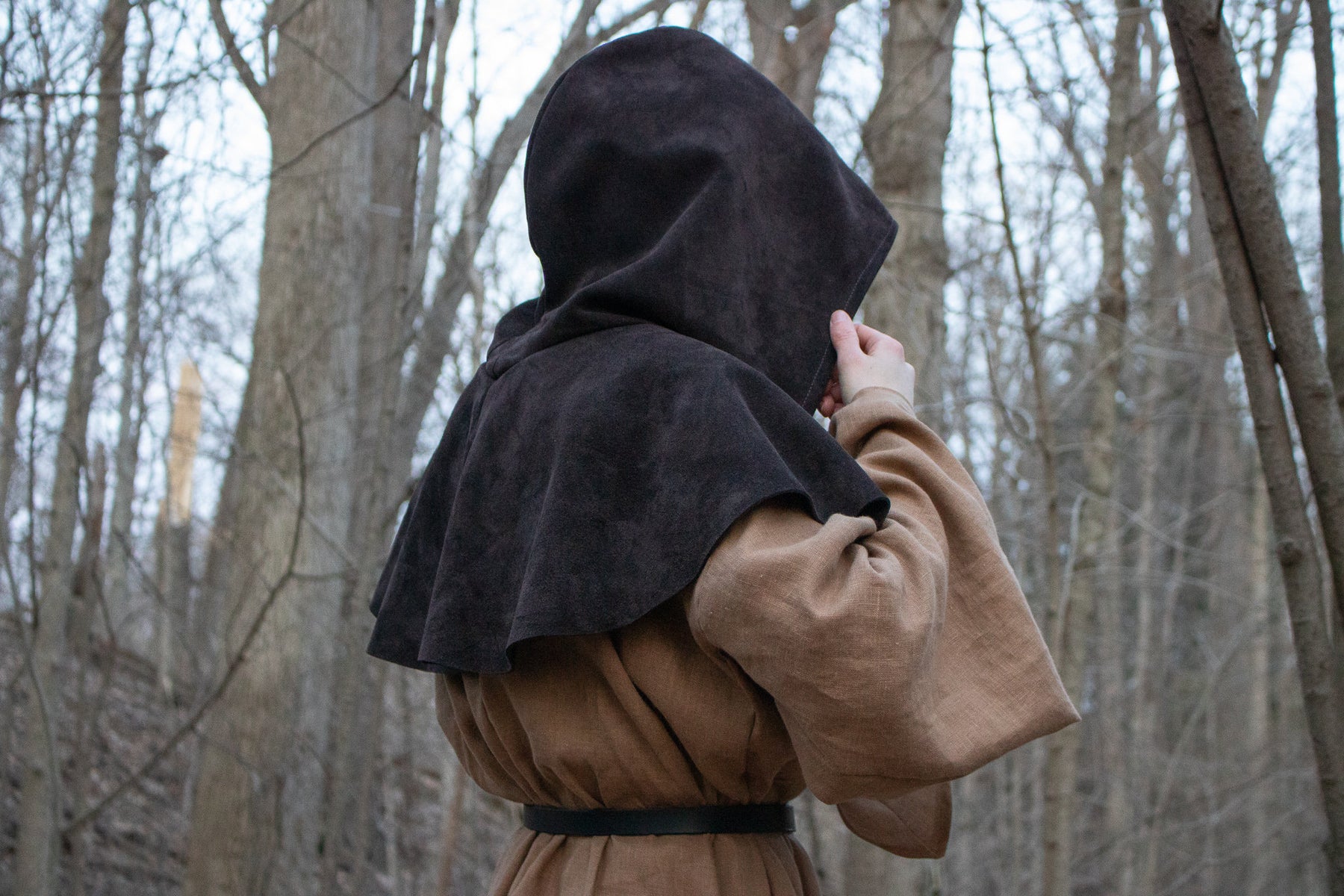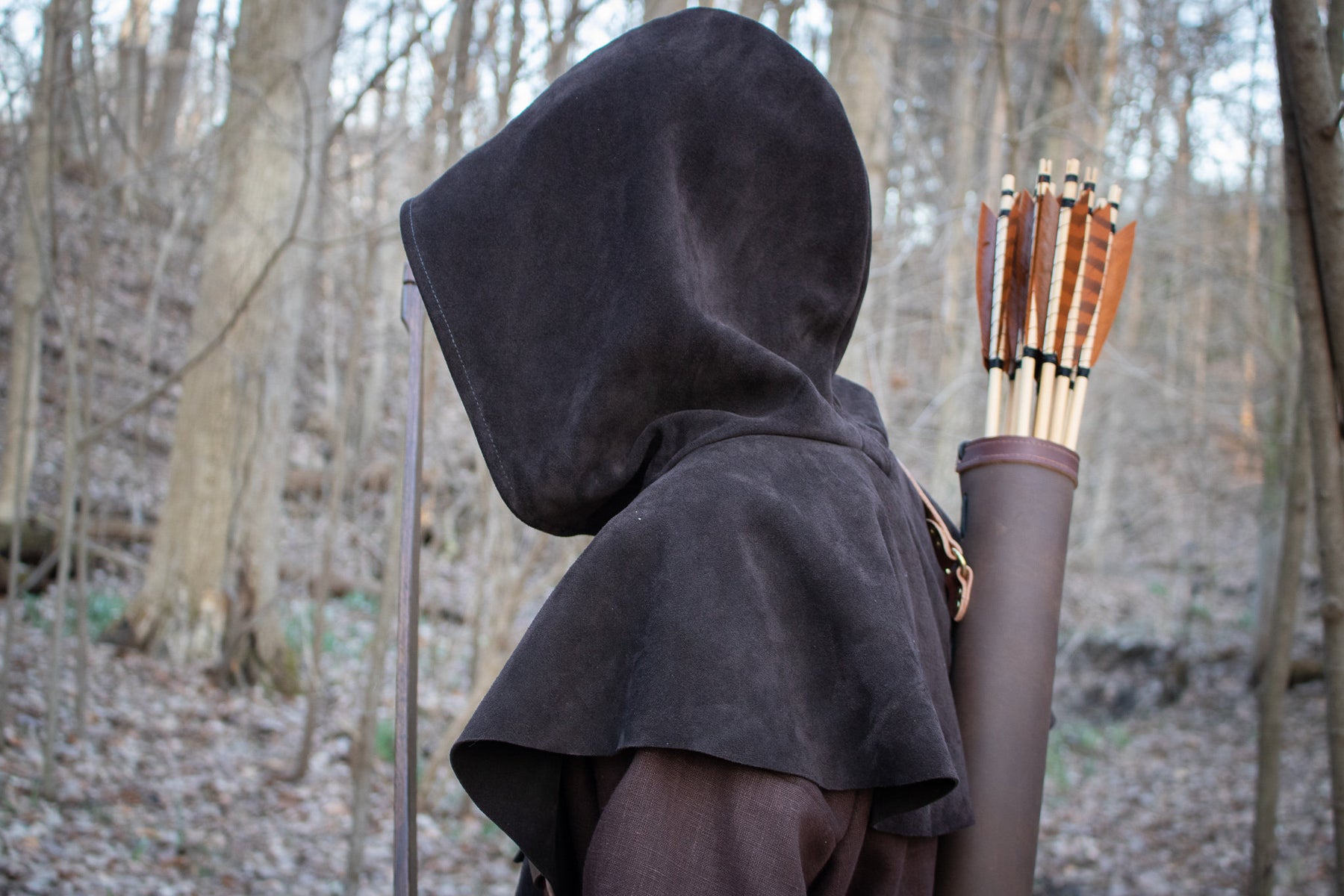 Our classic Medieval leather hood! Great costume finishing piece for archers, rangers, nobles, commoners, elves and many more. Keep the sun and rain off your next Renaissance Fair or LARP event. Made with durable heavy cowhide suede, in black or dark brown. Pulls over head, roomy neck adult one size fits all.